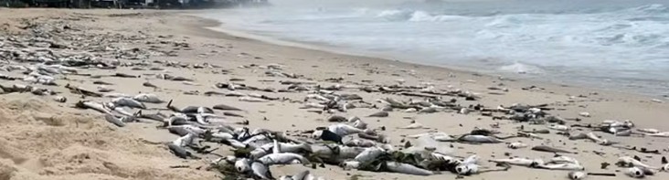 A Praia da Barra da Tijuca, na Zona Oeste do Rio de Janeiro acordou um dia desses quentes e chuvosos com milhares de peixes mortos cobrindo a areia e as