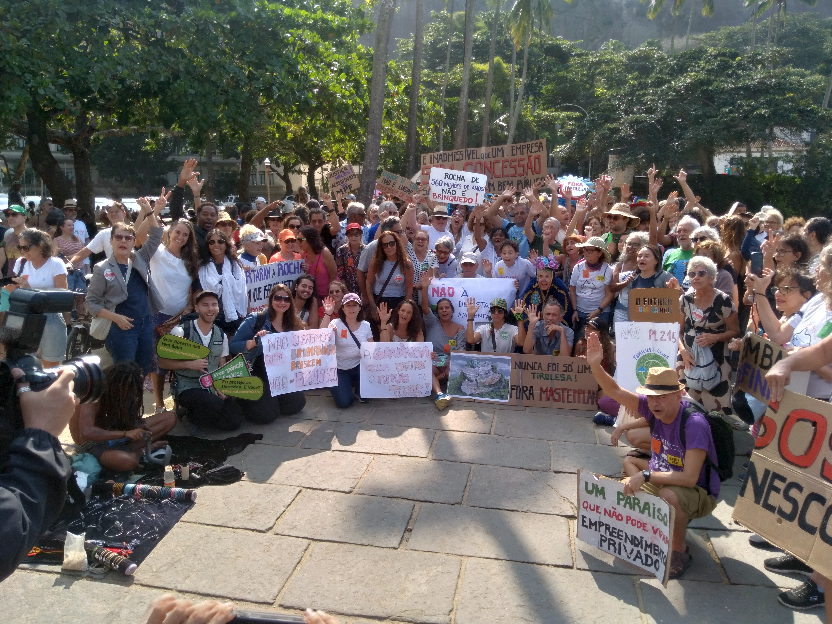 O movimento Baía Viva esteve presente no protesto organizado pelo movimento Pão de Açúcar sem Tirolesa, neste domingo, primeiro de Junho. A data foi marcada por protestos em todo o país para alertar a população sobre os riscos da PL 2159, já aprovada no Senado. Cerca de 500 pessoas compareceram para barrar também a ideia absurda de criar um brinquedo ( Tirolesa ) num patrimônio nacional.