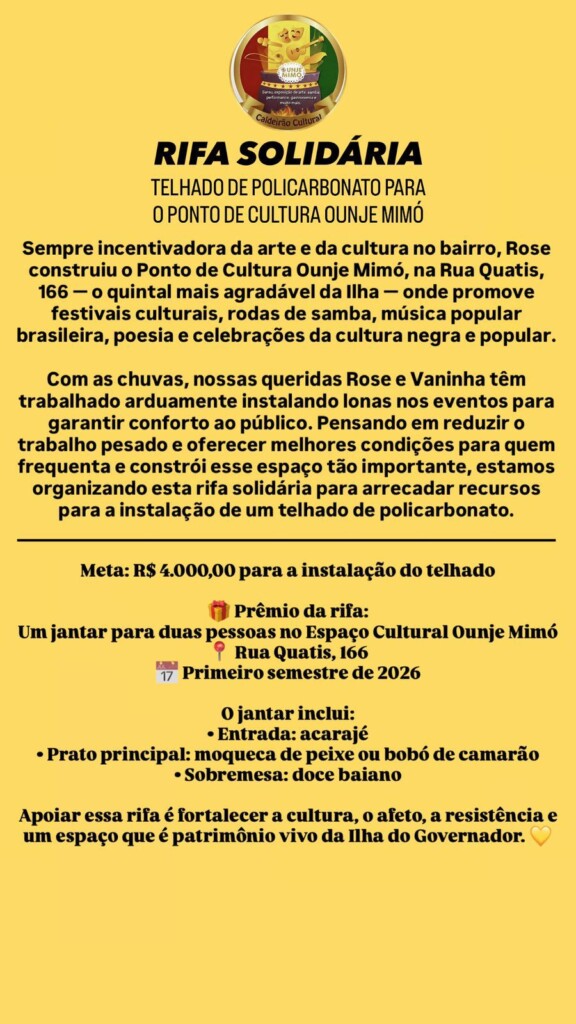 Construir esse telhado é mais do que erguer uma estrutura: é garantir dignidade, continuidade e cuidado. É permitir que Rose Baiana e Vaninha não precisem mais carregar, montar e desmontar lonas a cada atividade, exaustas, quando o que elas fazem é sustentar um dos espaços culturais mais importantes do nosso território. Telhado é proteção, é permanência, é futuro!