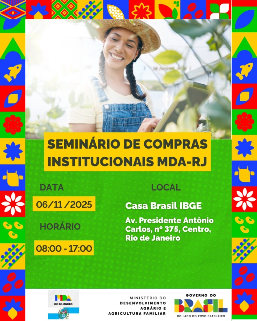 🤝 O Ministério do Desenvolvimento Agrário-RJ vai promover o Seminário de Compras Institucionais na Casa Brasil IBGE no dia 06 de novembro. É uma excelente oportunidade gratuita para instituições e coletivos que já estão produzindo horti-frutigrangeiros no entorno da cidade, como em Guapimirim.
